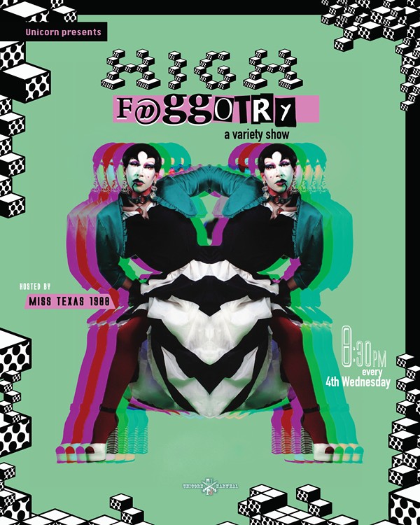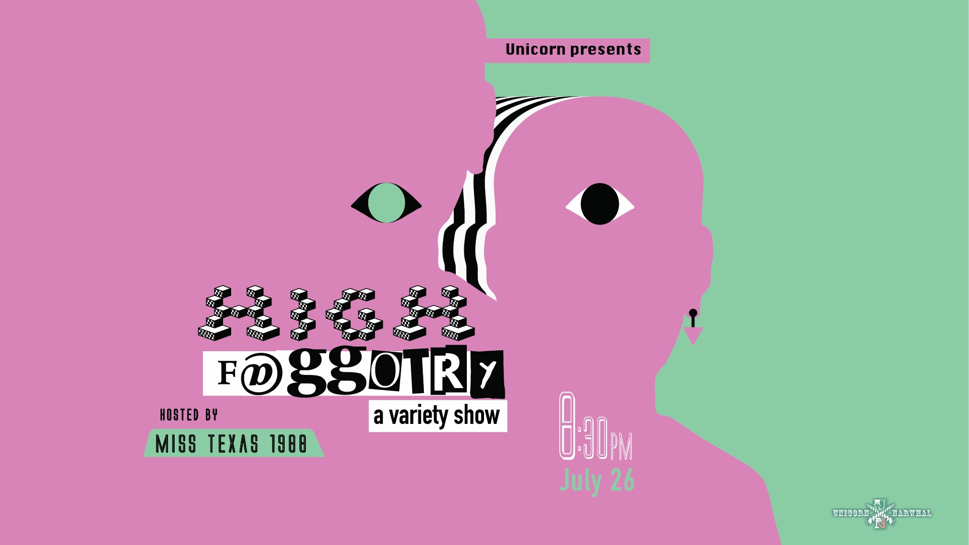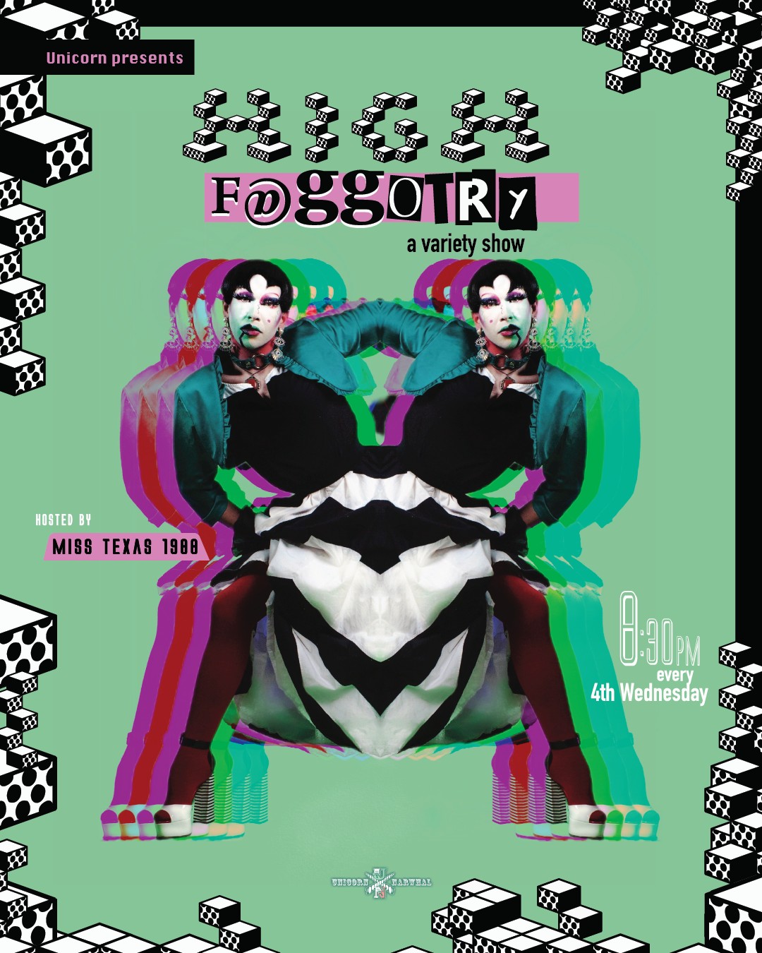 High F@ggotry - a true variety show bringing you seattle’s finest artists from the full spectrum of freaky f@ggotry, glamorous gayety, and good old-fashion quality queerness. Hosted by Drag Performer Miss Texas 1988, this show brings you a rotation of drag artists, musicians, burlesque, stand-up, dance, ridiculous-experimental-nonsense and more!