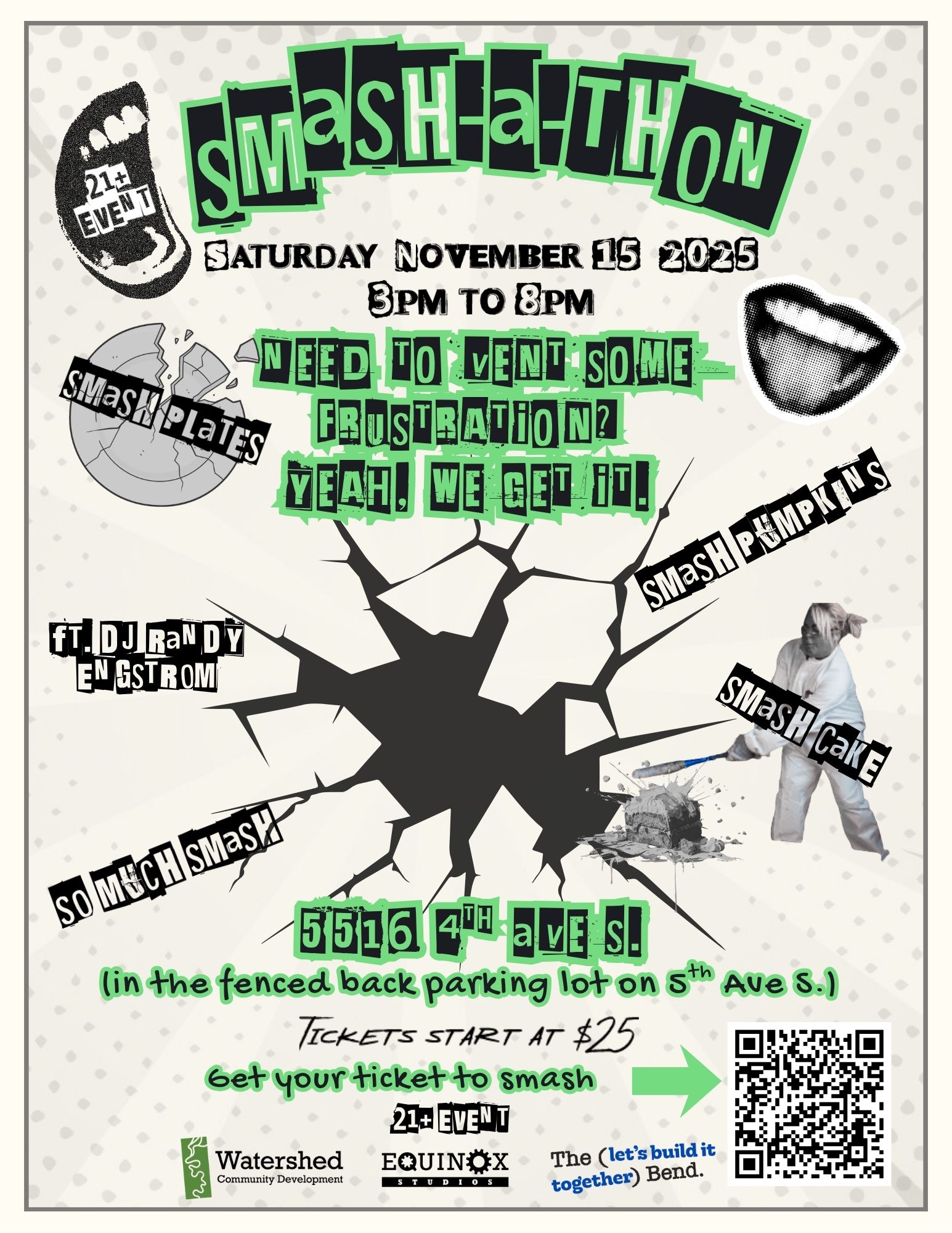 Join us at Smash-a-thon, an opportunity to unleash some pent-up frustration in service of maintaining and creating affordable housing and workspaces in the Duwamish Valley. There will be a variety of smashing stations including: plate tossing, table flipping, fizz ball batting cage, pumpkin drop, and more!