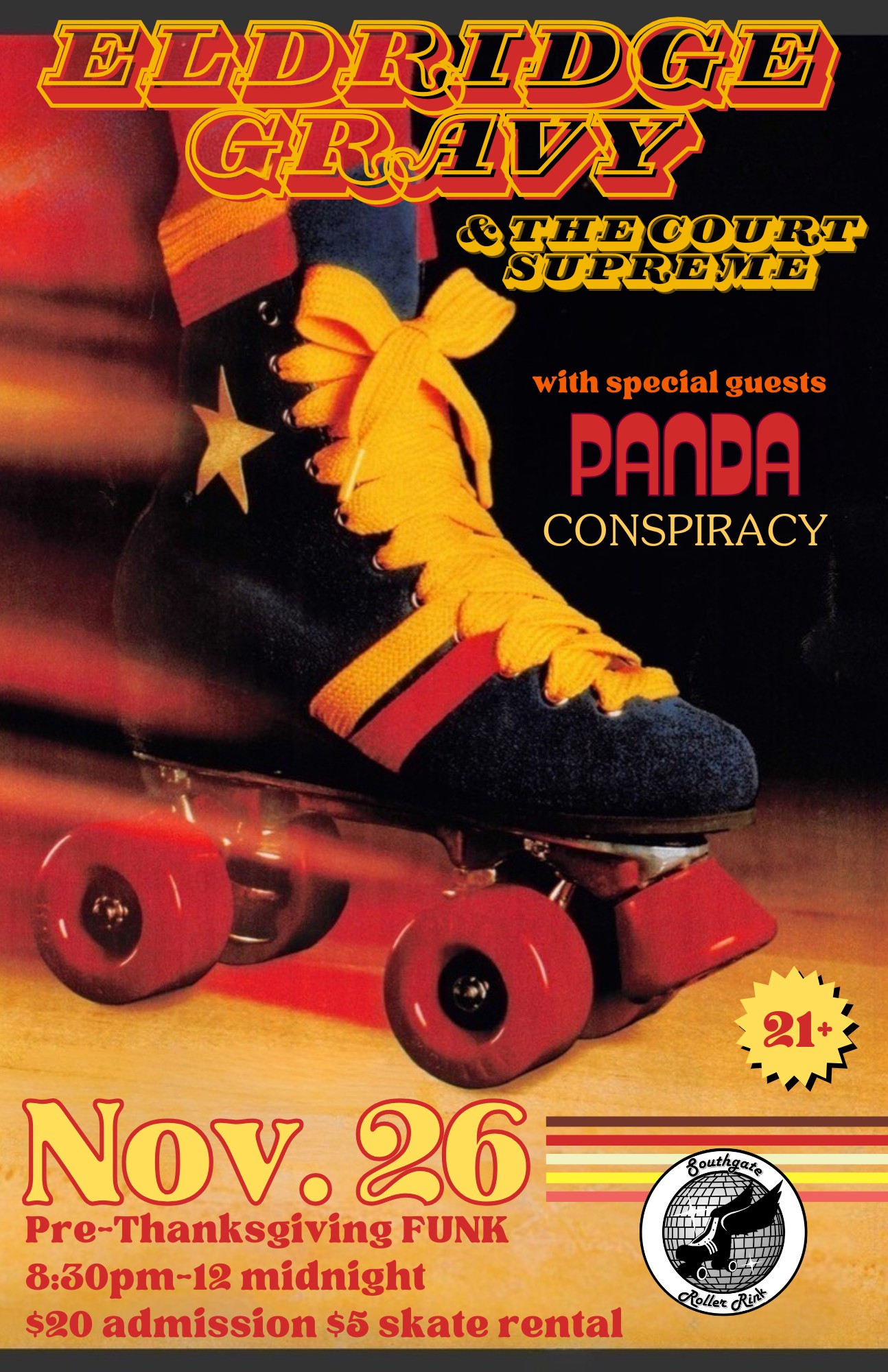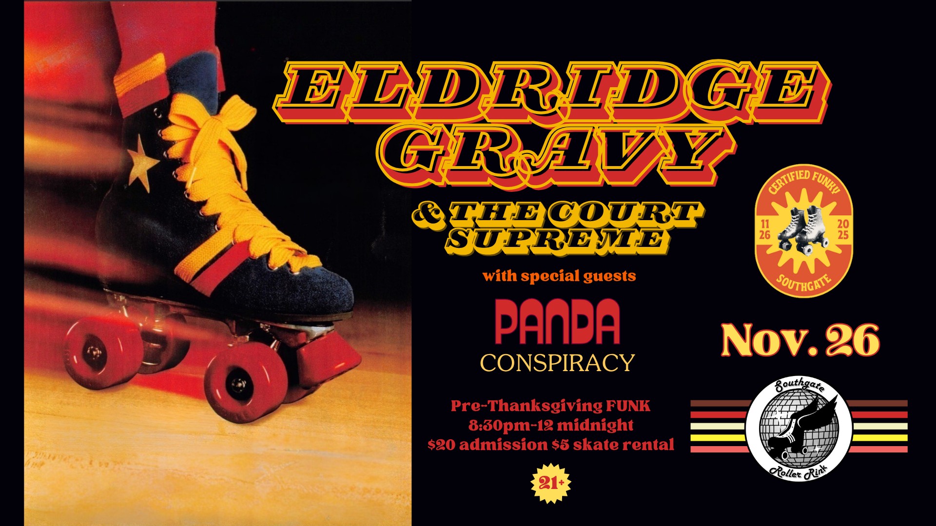 It's time for our ANNUAL PRE-THANKSGIVING FUNK PARTY with Eldridge Gravy & the Court Supreme with guests Panda Conspiracy! This event is one you do not want to miss skate on the floor to live music playing in the center of Southgate Roller Rink 8:30pm-12am 21+ (ID required) $20 admission, $5 skate rental.