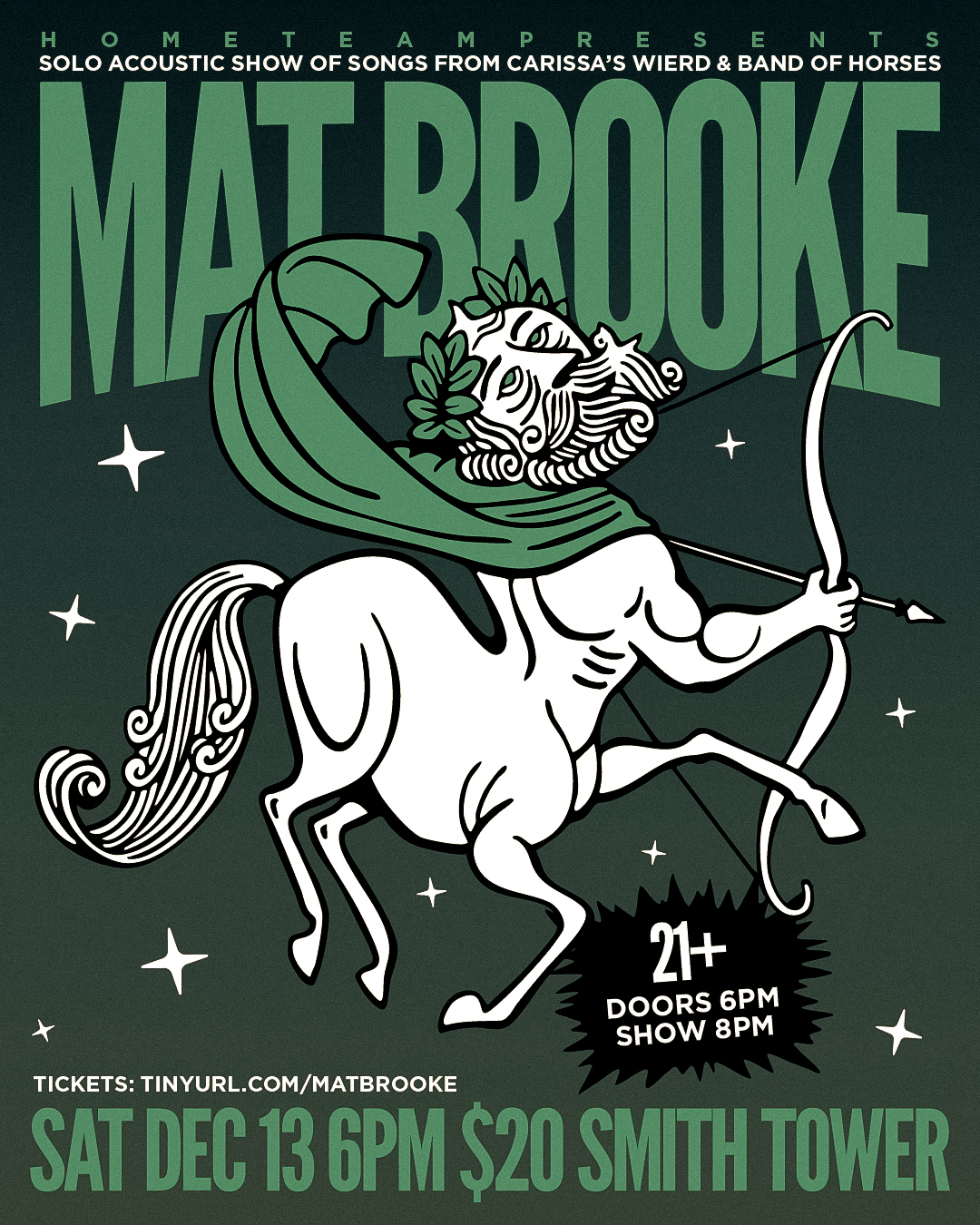 Join us high above the city for an intimate solo acoustic performance by Mat Brooke, co-founder of the band Carissa’s Wierd, Grand Archives, and Band of Horses. Set in the historic Observatory atop the Smith Tower, this special night brings Mat’s haunting lyricism and understated charm to one of Seattle’s most iconic spaces.