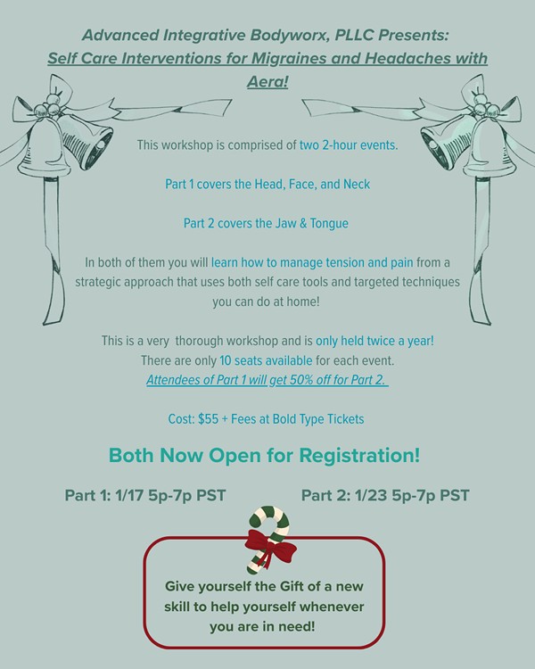 By registering for this workshop you consent to having the workshop recorded. Parts of the workshop may be used in future marketing materials for Advanced Integrative Bodyworx PLLC.