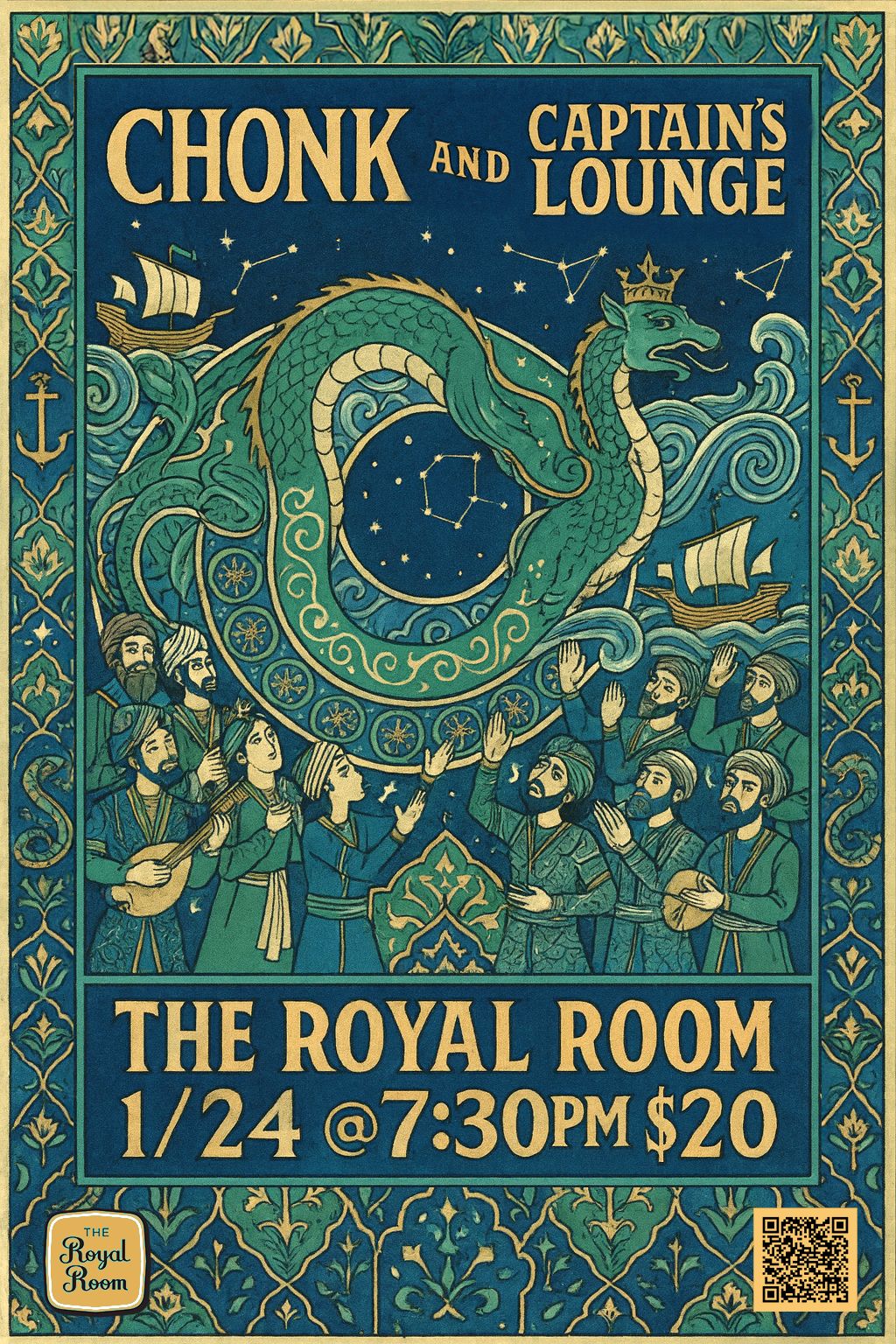 CHONK: CHONK pays homage to and blends funk, psychedelic rock, and blues, with hints of intergalactic space noise. Formed in 2024 and healing from Seattle, CHONK loves to settle into a groove and plunder the depths of aj am. Come hang out! CHONK is Alex Bauumler, Ben Jahn, Dom Campese, and David Citrin.