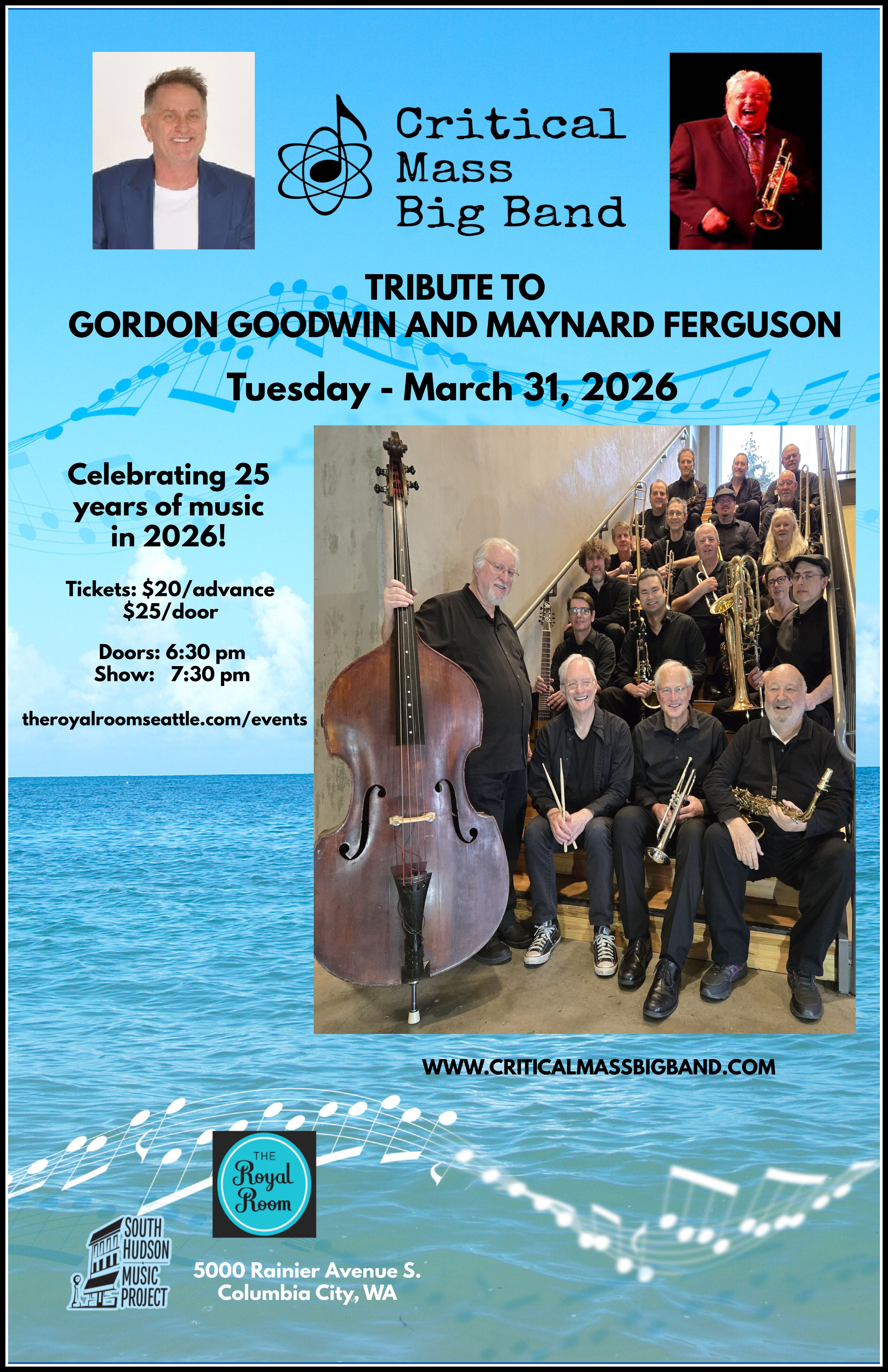 Critical Mass Big Band has been a cornerstone of Seattle's contemporary jazz scene for nearly 25 years, consistently delivering electrifying performances that leave audiences spellbound. Under the musical direction of Ian Basques-Jellison, this premier jazz ensemble features five saxophones (Paul Gillespie, Barbara Hubers-Drake, Al Lowe, Ian Basques-Jellison, Sara Voskuhl), four trombones (Jim Elder, Dave Buck, Doug Lora, Vinnie Christ), five trumpets (Marty Molloy, Jeff Leinbaugh, Mark Baker, Greg Klein, Victor Ross), piano (Seth Ahnert), guitar (Neal Adams), bass (Phil Demaree), and drums (Rob Parks). Their energetic big band jazz is sure to impress.