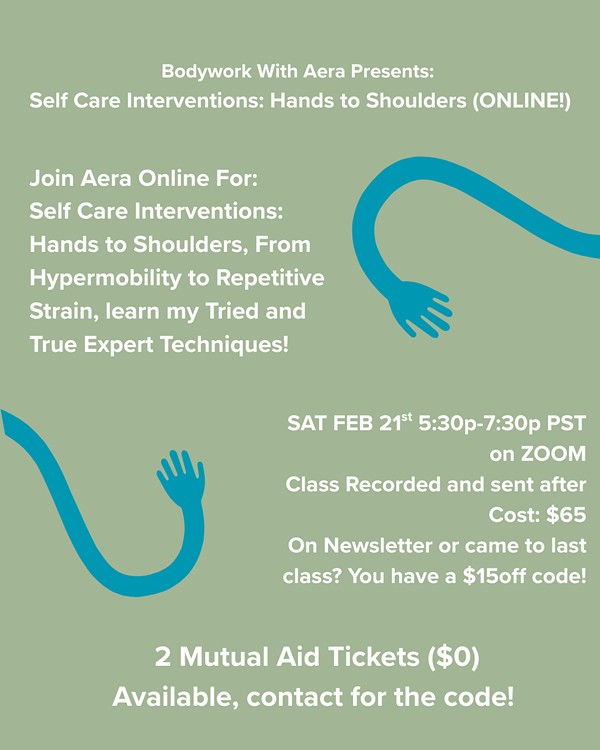 This class was first launched in 2024 as a solution to getting tried and true self care education out to those struggling with chronic pain. These are everyday techniques and strategies that Aera uses to manage their hypermobile Ehlers-Danlos, Thoracic Outlet Syndrome, and Repetitive Strain pains.