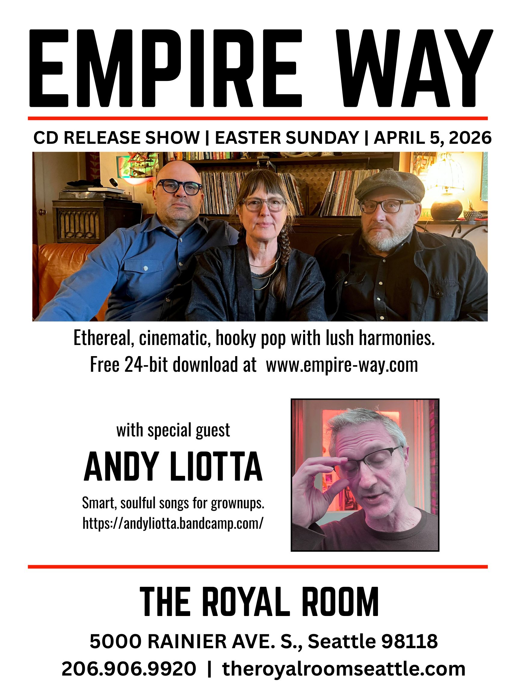 EMPIRE WAY Celebrating their debut album, a true labor of love. Hooky, ethereal, cinematic, almost-live sound, with lush harmonies, moody cello, great lyrics and memorable melodies. Every song is unique and different — and every song is unmistakably Empire Way. Rudy Yuly, Shelli Markee and Dwight Gilmore.
