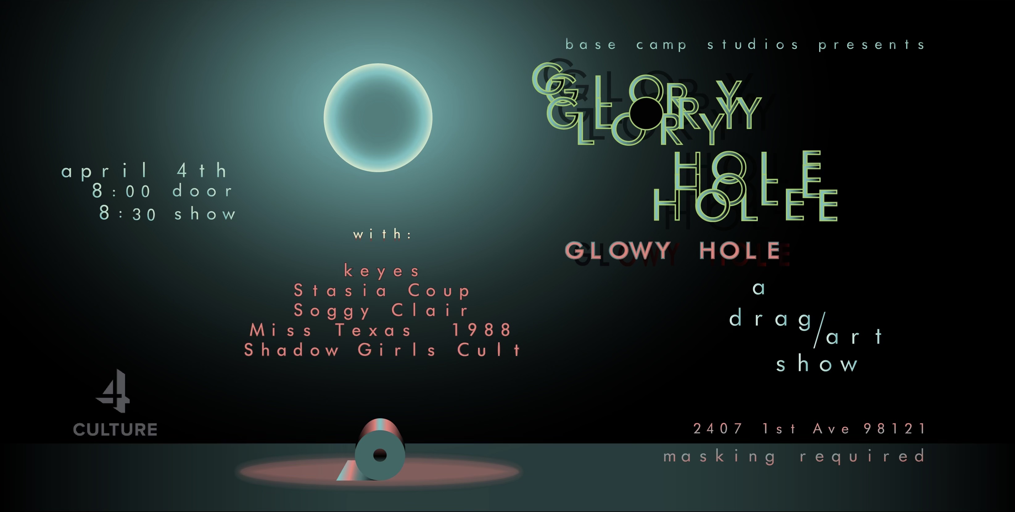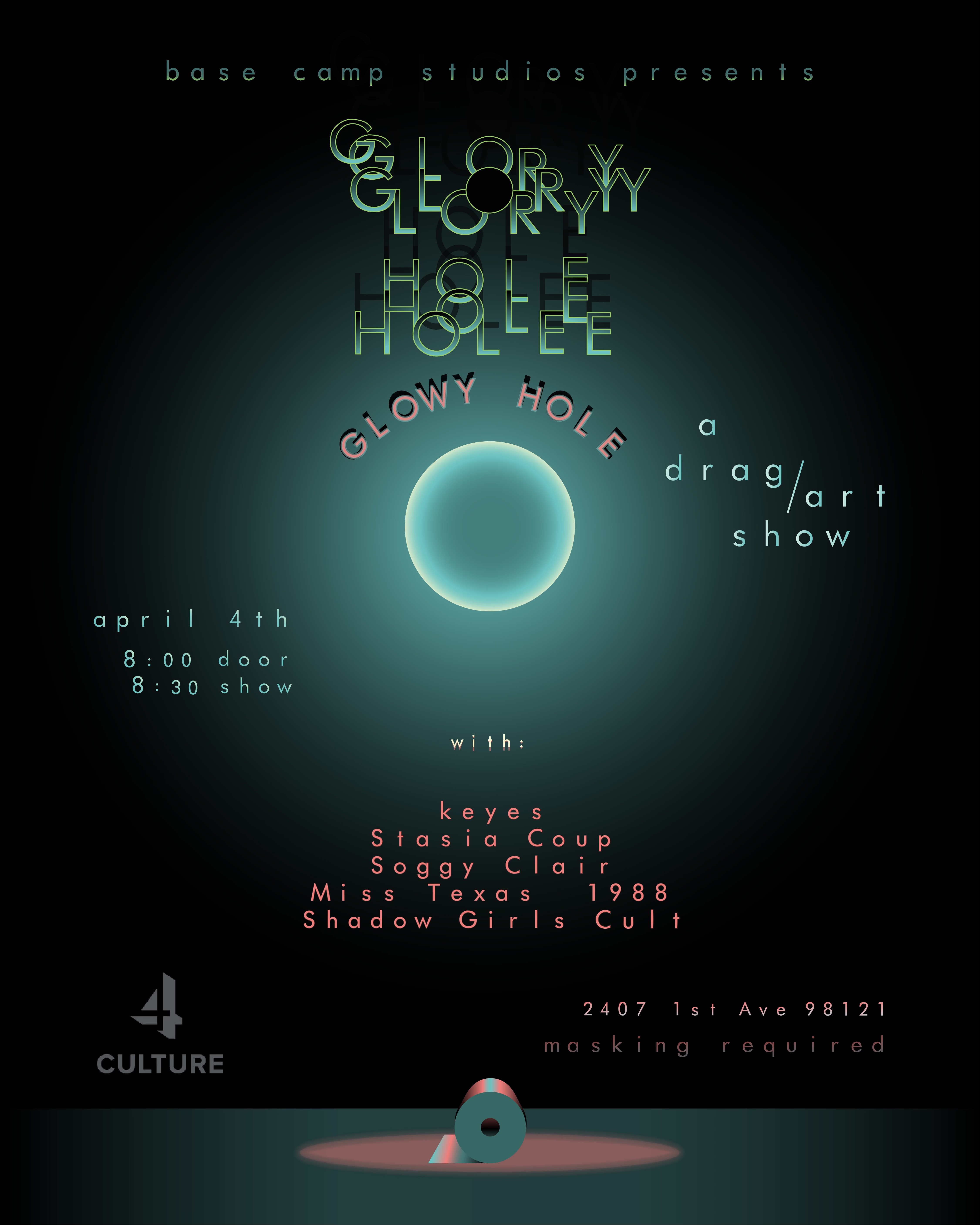 Where: Base Camp Studios in Belltown: 2407 1st Ave, Seattle, WA 98121 (please note, this is a different venue than Glory Hole: Clone!)