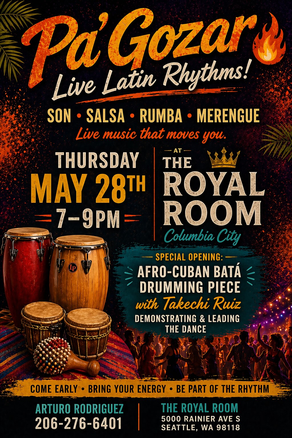 From the deep roots of Cuban son and rumba to the vibrant sounds of Puerto Rico, Venezuela, Colombia, and the Dominican Republic, Pa’ Gozar celebrates the rich tapestry of Caribbean music. Every rhythm tells a story. Every groove connects us. Featuring an Opening Traditional Afro Cuban Piece on Bata Drums.