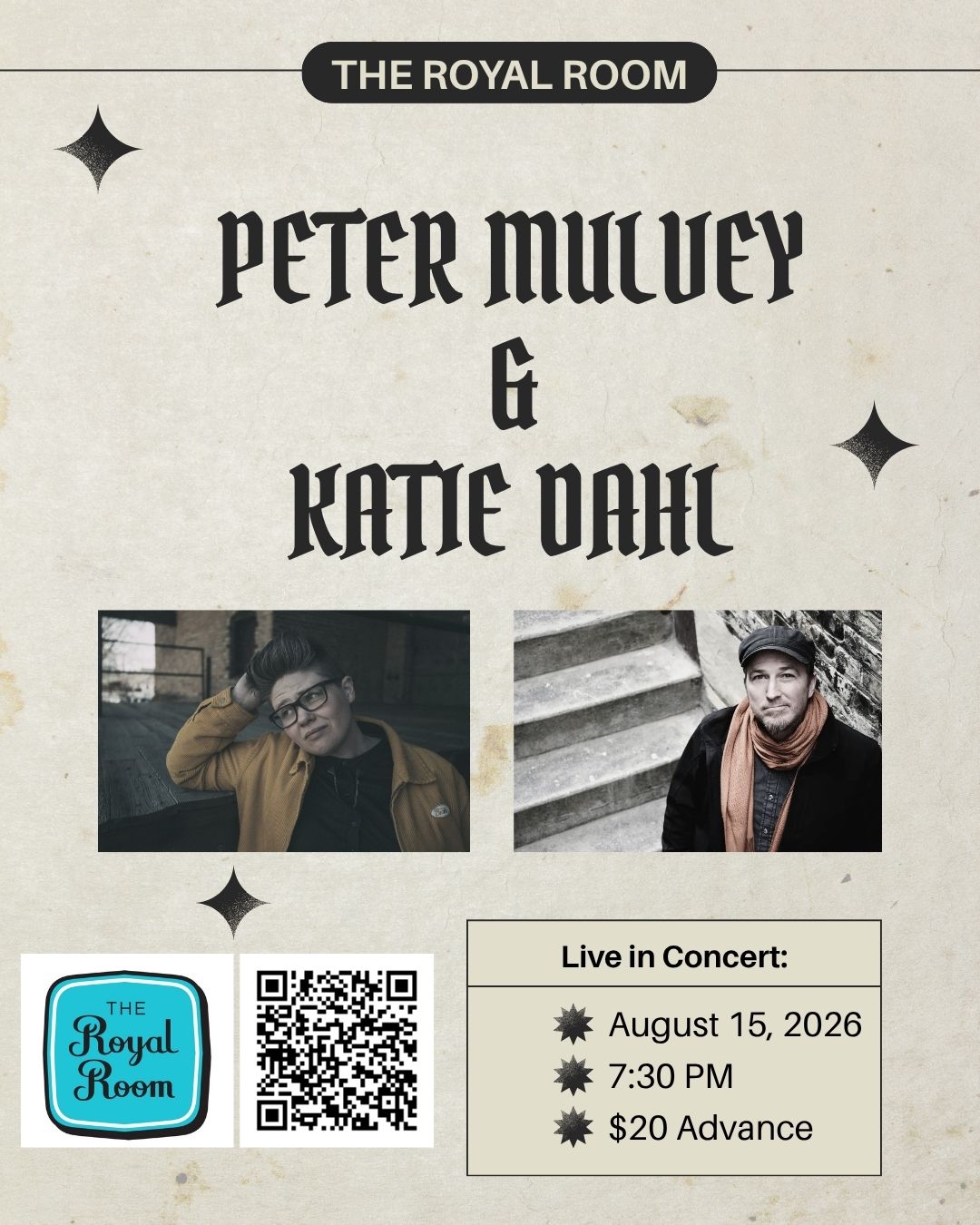 Peter Mulvey and Katie Dahl bring their world-class songwriting, sharp humor, and deep empathy to the Royal Room for one night only.