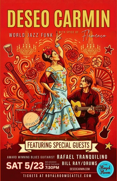 Prepare for an electrifying evening of rhythm, passion, and global sound as DESEO CARMIN, Seattle‑based award‑winning Latin Jazz–Funk–Flamenco fusion band, brings its high‑octane performance to the stage. Known for their fiery musicianship, theatrical flair, and genre‑bending sound—often described as “Spanish music with an edge”—the band promises an unforgettable night of music and dance.