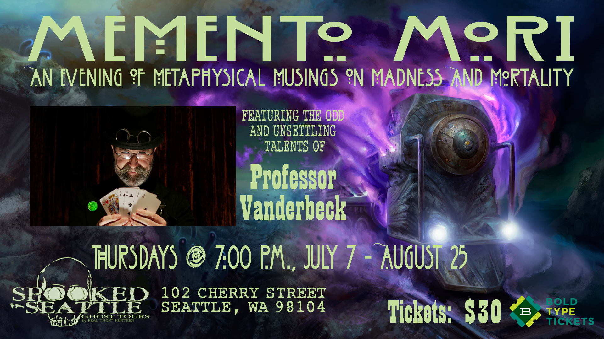 Join PROFESSOR VANDERBECK as he takes the audience on a 90-minute long surreal journey exploring the themes of madness and mortality, while surrounded by the unearthly artifacts found in Spooked in Seattle's famous Death Museum.