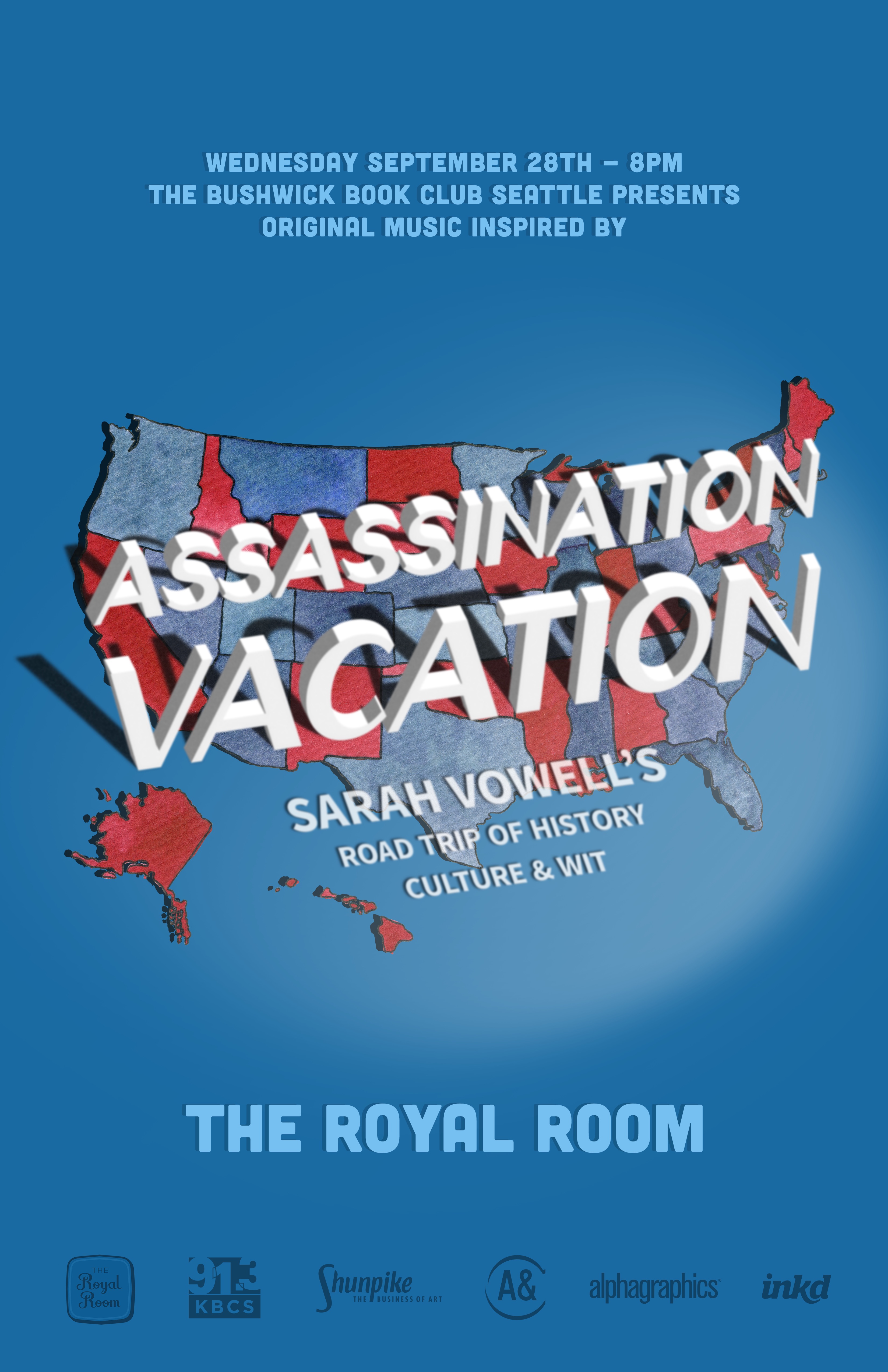 The Bushwick Book Club Seattle presents original music inspired by Sarah Vowell's Assassination Vacation. Sarah Vowell is a hilarious historian who entrenches her personality inside her writing. With this book, Sarah Vowell exposes the glorious conundrums of American history and culture with wit, probity, and an irreverent sense of humor. With Assassination Vacation, she takes us on a road trip like no other—a journey to the pit stops of American political murder and through the myriad ways they have been used for fun and profit, for political and cultural advantage.