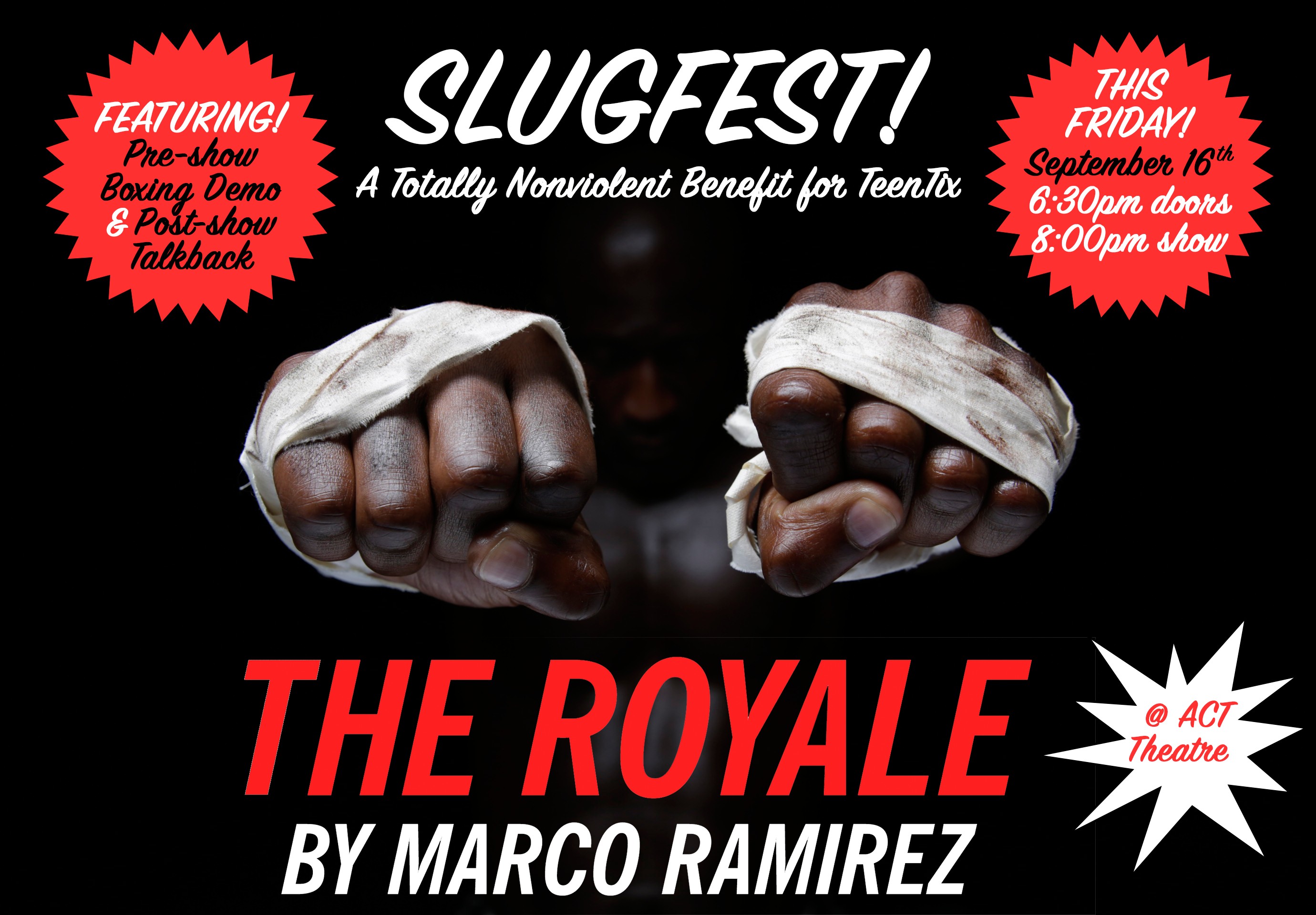 Our friends at ACT Theatre + the TeenTix New Guard: Teen Arts Leadership Society are excited to invite you + yr fam to Slugfest! A Totally Nonviolent Benefit for TeenTix @ The Royale, inspired by the story of Jack Johnson, the first African-American Heavyweight Boxing Champion in the world, and directed by percussionist Ameenah Kaplan (STOMP!, Blue Man Group, Cirque du Soleil).
