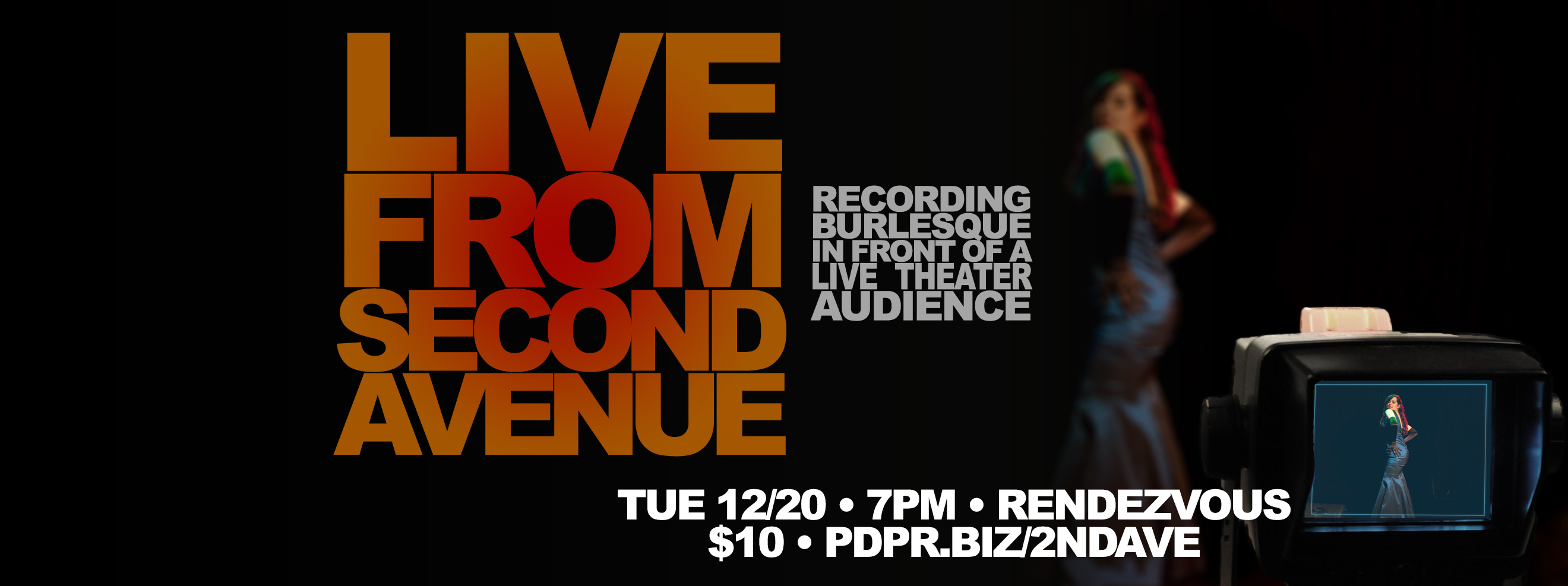 Festival Application Season is that special time of year when performers get their acts together submit them to various burlesque festivals with the hopes of performing and maybe even coming home with a title. At Live From Second Avenue, burlesque performers get together to video record their numbers as festivals have require a video of the act before they'll accept it. Since recording a video in your living just doesn't have the same punch, we're recording it at the Rendezvous Jewelbox Theater and we want you to to be a part of it all! Be in the the live studio audience at the Rendezvous Jewelbox Theater on December 20th and the show begins at 7:00 pm. Tickets are only $10!