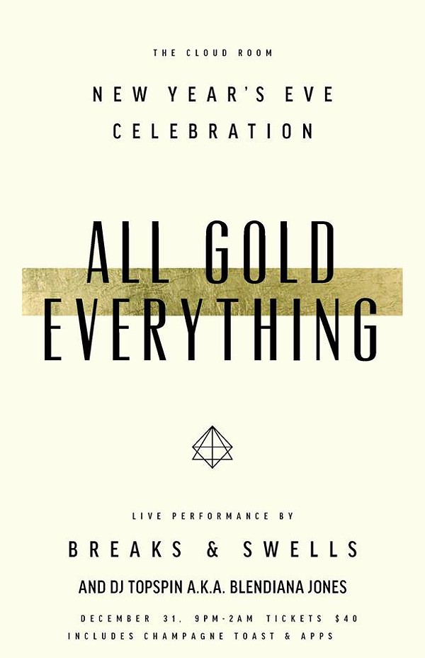 Join us for a New Year's Eve Celebration of ALL GOLD EVERYTHING here at The Cloud Room! There will be a live performance by Breaks and Swells and DJ Topspin A.K.A. Blendiana Jones will be playing your favorite tunes to get you on the dance floor! Toast to the New Year with a complimentary glass of bubbly and enjoy our delicious appetizers made by Outside The Box. This night is sure going to sparkle and shine. See you there!