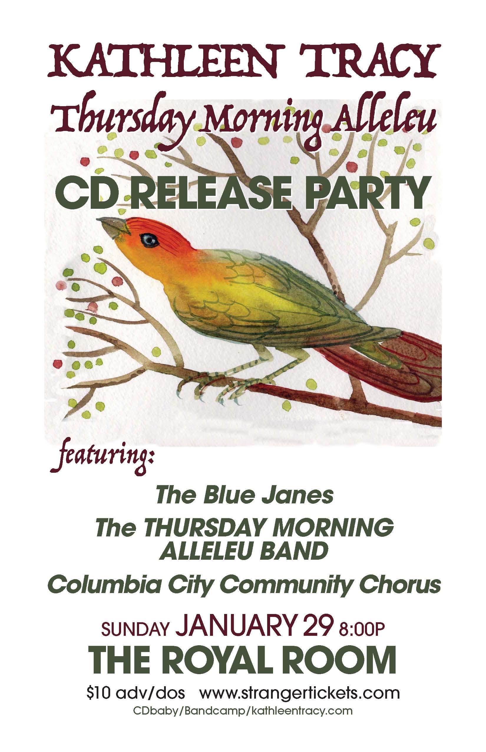 Indie folk artist (and Columbia City neighbor) Kathleen Tracy’s songs cut to the heart of what it means to be alive. Her work is literate and emotionally revealing, and her soulful performances offer humor, courage and tenderness. Kathleen's Seattle musical roots go back to the 80’s as a solo artist and with the folk/rock trio Modern Fabrics (Cyd Smith and Linda Severt). Lately she’s one third of the ukulele trio The Blue Janes (Arni Adler and jean mann) and founder and director of the Columbia City Community Chorus. At this CD release party, Kathleen will be joined by The Blue Janes and other special musical guests including Bill Corral, (guitar); Larry Jones, (drums); Brian Kent, (sax); Steve Kim (keys and bass), Linda Severt (percussion), and more.