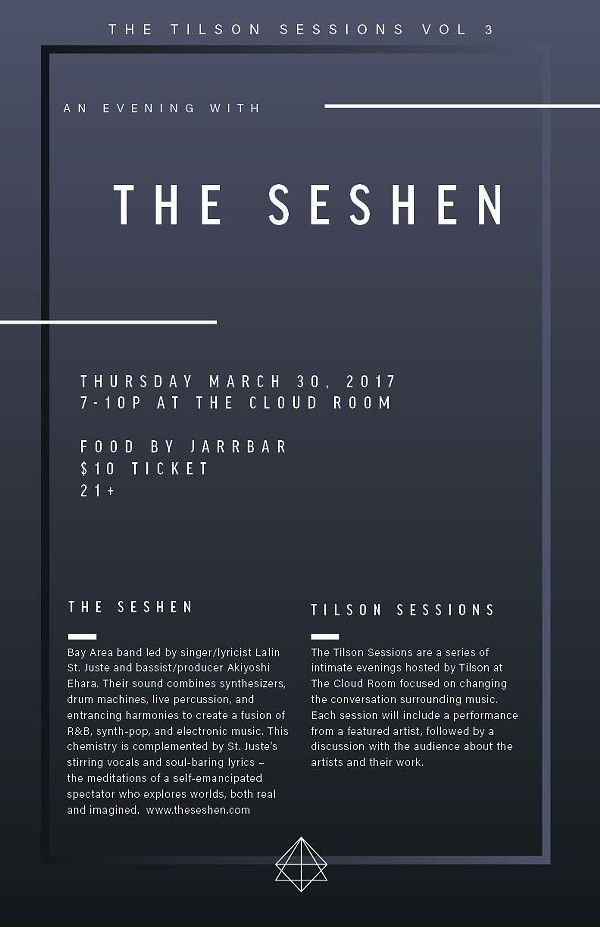 Join us for another special evening at the Cloud Room, Tilson Session Vol. 3 featuring The Seshen. A San Francisco Bay Area-based band led by singer/lyricist Lalin St. Juste and bassist/producer Akiyoshi Ehara. Their forward-thinking sound combines synthesizers, drum machines, live percussion, and entrancing harmonies to create an unmistakable fusion of R&B, synth-pop, and electronic music. This chemistry is complemented by St. Juste’s stirring vocals and soul-baring lyrics – the meditations of a self-emancipated spectator who explores worlds, both real and imagined. FInd out more on their website: www.theseshen.com