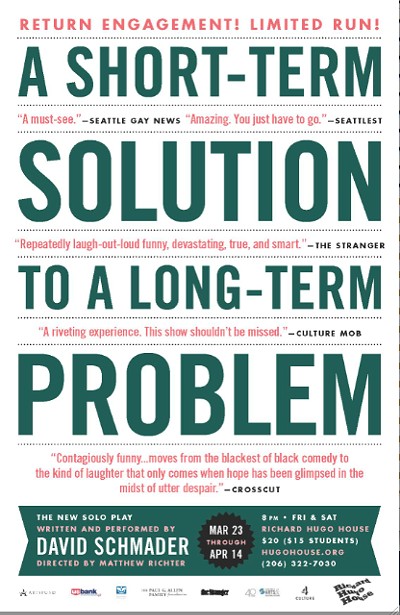 A comedy about unfunny things, “A Short-Term Solution to a Long-Term Problem” is writer/performer David Schmader’s solo play about the dramatic life upheaval that drove him to spend a decade “living every day like it’s your last!”—a profoundly ridiculous adventure that finds Schmader aiming his pointy-headed, fall-off-your-seat wit at marriage, Mormons and the type of relaxation that comes from watching a baby get a spray tan.