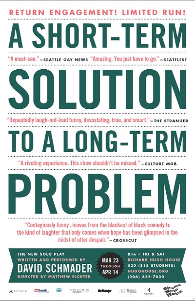 A comedy about unfunny things, “A Short-Term Solution to a Long-Term Problem” is writer/performer David Schmader’s solo play about the dramatic life upheaval that drove him to spend a decade “living every day like it’s your last!”—a profoundly ridiculous adventure that finds Schmader aiming his pointy-headed, fall-off-your-seat wit at marriage, Mormons and the type of relaxation that comes from watching a baby get a spray tan.
