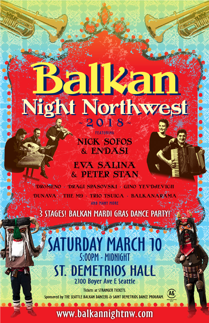 Balkan Night Northwest is a joyous explosion of music, dance and tradition from all over the Balkans, from Albania, through Serbia, Croatia, and Macedonia, Greece, Bulgaria, Romania and beyond! This community event welcomes people of all ages, making this a family event for kids and grandparents alike. This year we have 30 bands providing non-stop music on three stages, with delicious ethnic food provided by the Seattle Croatian and Greek communities. Bring your friends! No dance experience necessary!